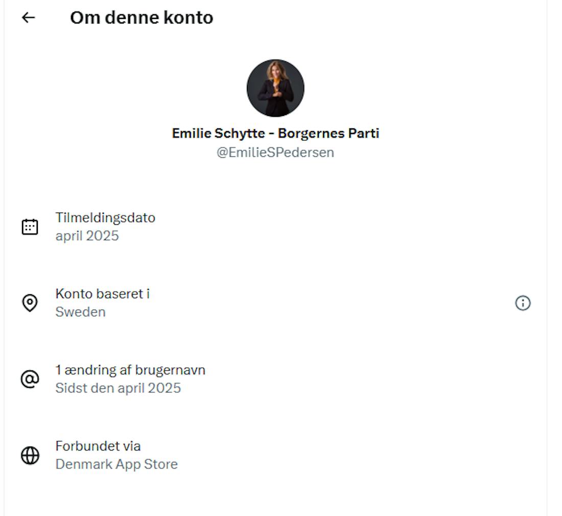 Efter valget er hendes politiker-profil af X nu registreret som “baseret i Danmark”. Det skyldes, at lokationen opdateres i takt med profilens aktivitet.